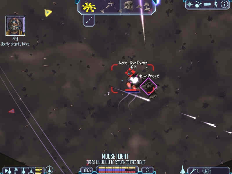 Правда, торопиться некуда, поэтому ничто не мешает игроку попутешествовать в свое удовольствие и освоиться с управлением. Последнее, кстати, требует небольшого "освоения". Признаться, пока загружалась игра, я бережно протирал свой давно не бывавший в боях старенький Logitech Wingman Warrior. Игра загрузилась, и джойстик вернулся на свое законное место на полке. Увы, он не понадобится. Управление заточено под грызуна и клавиатуру, причем раскладка классическая action'овая, даже стрейф имеется. Честно говоря, после Starlancer, где джойстик отменно мне послужил, такой поворот событий несколько шокировал. Однако следует отдать должное кудесникам из Digital Anvil: к управлению привыкаешь быстро и безболезненно, а целиться мышью, оказывается, даже удобнее, чем джойстиком, хотя реализма, конечно, меньше. Вообще же, физика во Freelancer неоднозначна. Скажем, разбить корабль о здоровый кусок болтающейся в космосе арматуры невозможно, защитные поля не позволяют, да и корпус далеко не картонный. Зато вполне реально долететь до планеты и живописно сгореть в плотных слоях атмосферы, если вы решили приземлиться без помощи специальных доков.