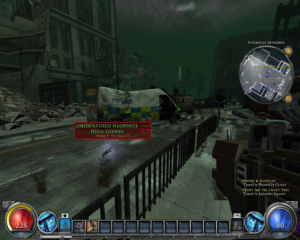 Выполнять монотонные задания было бы куда веселее, если бы декорации менялись почаще. Однако создатели почему-то решили, что бегать по одним и тем же уровням – предел наших мечтаний. Конечно, генерируются этапы случайно. Но из очень узнаваемых блоков. Побывав два-три раза на лондонских бульварах или в тоннелях подземки, сроднишься буквально с каждым полигоном. Ждешь, когда же наконец покажут что-нибудь еще. Но не тут-то было. И ведь живность, вот беда, не меняется. Зомби трех видов, импы, гигантские летучие мыши преследуют нас снова и снова. Неужели авторы не понимают, что разные противники и антуражи – одна из главных причин успеха Diablo 2? Это при том, что Blizzard сделала изометрическую игру, в которой от повторяющихся пейзажей устаешь намного меньше, чем в проекте от третьего лица. По сути, Hellgate: London проигрывает даже серии Dungeon Siege, не говоря уж о Titan Quest. И очень походит на Restricted Area – action/RPG с интересным футуристическим миром, где постоянно повторялись немногочисленные уровни и враги.