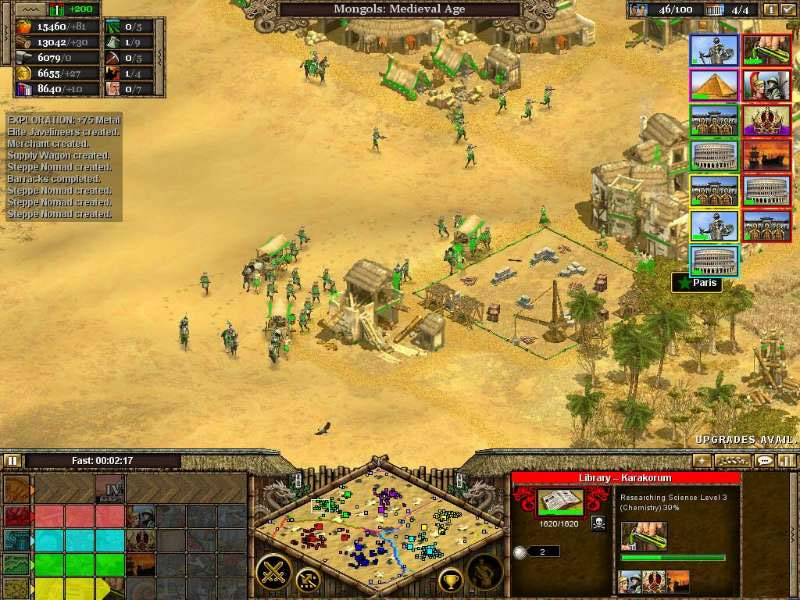 Кроме стандартных для всех стратегий ресурсов, которые теперь, кстати, не иссякают, появился новый ресурс "знание". Добывается новинка по аналогии с Сivilization - в университетах. Ученые усиленно шевелят мозгами, чтобы мы могли приобрести новые технологии или сделать апгрейд. Кстати об апгрейдах, теперь процесс их получения – не есть одно лишь бездумное кликание по всем доступным кнопкам, появился некоторый аспект стратегии. Есть четыре направления для исследования: военное, гражданское, торговое и научное. Над тем, что развивать в первую очередь, а что - во вторую, придется основательно подумать. Именно появление новых открытий, как вы уже могли догадаться, определяет переход к следующей эпохе. Для этого достаточно небольшого фиксированного количества достижений в любых, на ваш выбор, областях.