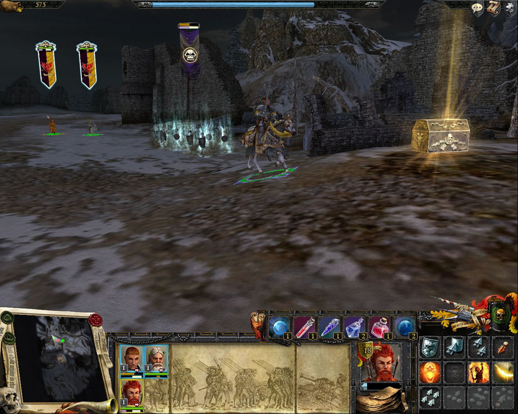 Боевой состав, который может участвовать в битве, ограничен. Четыре героя, десять отрядов, четыре осадных орудия – максимальное количество вакантных мест. Если с отрядами и орудиями все более-менее ясно, то о героях стоит рассказать подробнее. Они присутствовали и в предыдущих играх, и были гораздо сильнее сослуживцев. Но теперь в Mark of Chaos игрок волен сам воспитывать героя как заблагорассудится. При переходе на новый уровень он не только совершенствует основные качества, но и получает очки на развитие дополнительных заклинаний. Можно вкладывать очки развития в командные действия – подопечный, по мановению мыши, присоединится к отряду и будет исправно поднимать боевой дух или произносить заклятья, благотворно действующие на окружающих. Но разрешается прокачать и «эгоиста»: например, маг, достигший высшей точки развития, в одиночку раскидает несколько вражеских отрядов. Третья ветка позволяет вырастить свирепого монстра, без труда расправляющегося с противниками в дуэлях.