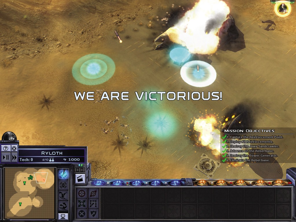 В почти 800-мегабайтной демо-версии нам предлагают пройти пять обучающих и одну полноценную миссию с боями в космосе и на поверхности Татуина. Что мы ждали от баталий в безвоздушном пространстве? Бесконечные трейлеры и картинки демонстрировали нам нечто невыразимо яркое, напористое и, конечно же, кинематографичное. Но когда дело дошло до выхода в открытый космос, игра стыдливо подсунула нам обыкновенную тактическую RTS в двух измерениях, где на границе карты расположено поле астероидов, а все неисследованное пространство покрыто традиционным «туманом войны».