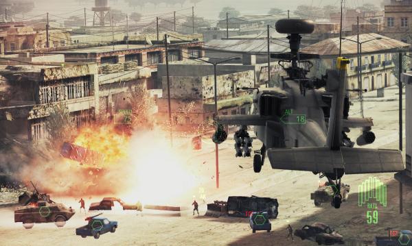 Вертолетные миссии устроены совсем иначе. Рассекать небо на больших скоростях не получится — нужно постепенно двигаться вглубь вражеской территории, методично уничтожая пехоту и технику. Солдат бывает трудно разглядеть, но это и не требуется, поскольку каждый раз в ходе прицеливания орудия машины сами наводятся на врага. В некоторых миссиях участвует пехота союзников, ее нужно всячески оберегать, расчищать ей путь от недоброжелателей. Такие миссии немного затянуты, а потому менее увлекательны, но изменение темпа идет Assault Horizon только на пользу.