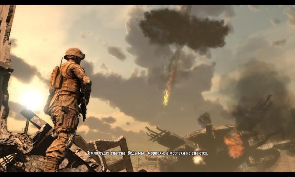 Завязка столь же нелепа и натянута, как и мотив агрессоров, прилетевших на Землю, чтобы пополнить... запасы воды. Зато она позволяет поместить небольшой отряд морпехов в быстро ставший негостеприимным город, где на каждом шагу их пытаются расстрелять и взорвать. Чтобы подчеркнуть напряжение, авторы вовсю используют типичные приемы из набора «Call of Duty своими руками»: пока вы воюете или бежите куда-то, на дорогу по соседству может с грохотом рухнуть подбитый самолет или рекламный щит. Или вдруг вылетит инопланетный корабль, жахнет по вам, и герой провалится на нижний этаж, чтобы потом в огне и дыму искать выход.