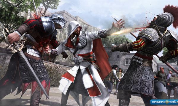 В Brotherhood этой проблемы нет. Стоит хоть раз вонзить клинок в незадачливого противника — и уже можно продолжать смертельную комбо-цепь, выбирая следующую жертву. Закончив с одним, Эцио без промедления набрасывается на следующего — разрубает, полосует и пронзает стражников одного за другим; некоторым счастливчикам в качестве бонуса достается пуля в голову... Меньше чем за полминуты можно украсить улицы Рима доброй дюжиной трупов; немногие уцелевшие зачастую в ужасе убегают.