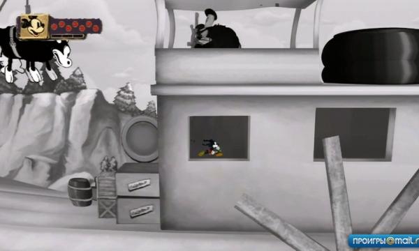 Где-то в середине игры на нас внезапно начинают сыпаться задания в духе «сходи к моему другу, возьми у него книги и принеси другому моему другу». Причем сыпаться они начинают в немалых количествах. Больше всего при этом раздражает то, что бегать приходится по нескольким локациям, а для перемещения между ними каждый раз надо проходить небольшой двухмерный уровень. Да, уровни эти сделаны действительно шикарно — Микки как будто попадает в мультфильмы 30-40-х годов. Каждый уровень соответствует какому-то одному мультфильму и оформлен по-своему уникально. Но беда в том, что между двумя локациями своеобразным телепортом всегда служит один конкретный мультфильм, а значит, придется раз за разом пробегать одну и ту же дистанцию.