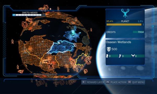 На этом сюрпризы не заканчиваются. На каждой локации есть телепорты, которые можно использовать не только для быстрого перемещения между контрольными точками, но и для захвата всей планеты. Кликнув на специальную кнопочку, вы переноситесь в серию UFO. Да-да, речь идет о стратегическом режиме, в котором нашему взору предстает голубой шар Пандоры, поделенный на секторы. Изначально практически все секторы находятся под контролем одной из сторон конфликта, и наша задача состоит в том, чтобы отвоевать их. Происходит это в пошаговом режиме: в свой ход вы решаете куда ходить, сколько единиц живой силы и техники перебрасывать и что делать на новом месте – возводить ли специальные здания, заказывать ли новых юнитов (за деньги, естественно) и каких именно. Все то же самое в свой ход делает и противник, которым управляет компьютер. Результаты боестолкновений обсчитываются автоматически и выводятся текстом. За захват новых территорий нас награждают опытом, а итоговая победа дает игроку сразу несколько приятных бонусов, которые будут учитываться и в обычном режиме.