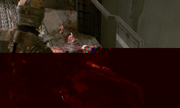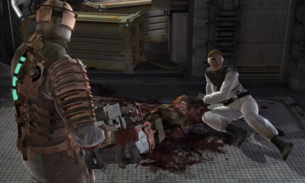 Но прежде всего перед EA Redwood Shores стояла задача напугать игрока. Создание «правильной» атмосферы ужаса и тотальной опасности, при которой не знаешь, кто, откуда и за что тебя схватит – главный тест на профпригодность для любого «хоррора». Тут Dead Space действует предсказуемо, но эффективно. Мы блуждаем в потемках, вздрагиваем от неожиданных шорохов и резкой смены освещения, видим, как монстры кого-то куда-то тащат, натыкаемся в полутемных комнатах на разорванные трупы и алеющие кровью надписи. При этом авторы не стесняются показаться банальными и лишенными собственной фантазии. Они, например, из раза в раз повторяют один и тот же излюбленный прием - запирают игрока в замкнутом пространстве и спускают на него сразу нескольких не в меру агрессивных монстров.