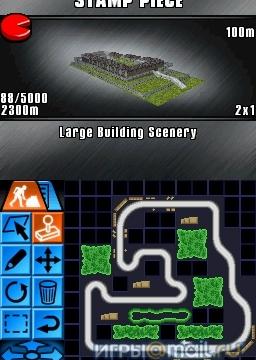 Куда интереснее виниловых картинок смотрится встроенный редактор, которому позавидует любой конструктор "Лего". С помощью стилуса в нем можно создать несколько гоночных треков самых запутанных конфигураций, используя готовые асфальтовые блоки, заборы, деревья и прочие элементы оформления. Готовые трассы без каких-либо ограничений используются в одиночных и сетевых заездах, включая соревнования через онлайновый сервис Nintendo Wi-Fi Connection.