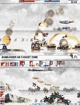 Верхний экран используется для управления самолетом, нижний отображает ключевые моменты стычек между наземными войсками. Но чаще всего внимание сосредотачивается на индикаторе прогресса — по нему легче всего отслеживать, когда следует тормозить или разгоняться. Сквозь грохот выстрелов и взрывов слышны бравые военные марши и крики безымянного комментатора. Последний здорово помогает пилоту, вовремя сообщая о прорыве очередной линии обороны или окончании процесса перезарядки. Стандартное управление при помощи кнопок не вызывает ни малейшего дискомфорта, и зачем нужно было его дублировать — не понятно. Рисуя замысловатые фигуры на сенсорном экране, много не повоюешь — стилус годится разве что для запуска баллистических ракет. Соперники прут друг на друга, словно лемминги: молча и ожесточенно. От воздушного аса требуется в основном быстро уничтожать танки и пехоту противника, приближая общую победу. От обилия обязанностей, возложенных на пилота, голова поначалу идет кругом. Однако очень быстро выясняется, что задачи эти не требуют излишнего внимания, и можно спокойно взяться за гашетку и с чистой совестью заняться сокращением поголовья противника.