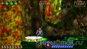 На броню особых надежд возлагать не стоит — достаточно пары ударов и Артур уже прыгает по скользким валунам в одних кальсонах. Выглядит комично, но смеяться совсем не хочется — еще один укус, и уровень придется начинать сначала. Приходится продолжать демонстрировать чудеса акробатики, к которым тело пожилого короля совершенно не предрасположено.