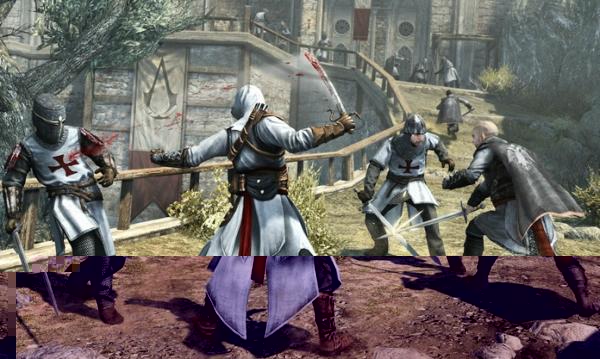 Ближе к концу демоверсии недобитый ассасин приканчивает главного стражника, отбирает у него тамплиерский ключ (также известный как инопланетный артефакт) и наблюдает «флешбэк» — эпизод из жизни своего предка Альтаира, каким-то образом связанный с общим сюжетом. Во время флешбэка Альтаир возвращается в Масиаф — клановый ассасинский замок из оригинального Assassin’s Creed и освобождает его от невесть откуда набежавших тамплиеров. В геймплейном плане тут уже все более привычно: он долго карабкается по крепостным стенам, режет горло уснувшему караульному, дерется на мечах с десятком рыцарей и, наконец, вступает в последний и решительный бой с «боссом» — старшим тамплиером в черном шлеме.