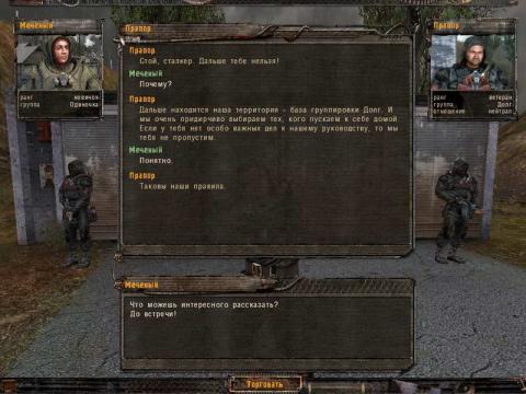 Далеко не всегда стоит ввязываться в драку. Многие конфликтные ситуации в игре можно решить мирным способом. Яркий пример — начало кампании, где герою нужно перебраться из района «Свалка» в район «Бар». Дорогу преграждают бойцы группировки «Долг». Не вступайте в конфликт и не обращайте внимания на их угрозы. Просто подойдите к двери, закрывающей проход, и выстрелите в нее. Дело сделано — дверь открыта! Но не стоит сразу же переступать порог — в этом случае противники мгновенно откроют огонь. Подождите, пока бойцы «Долга» отвернутся, а лишь затем следуйте в бар